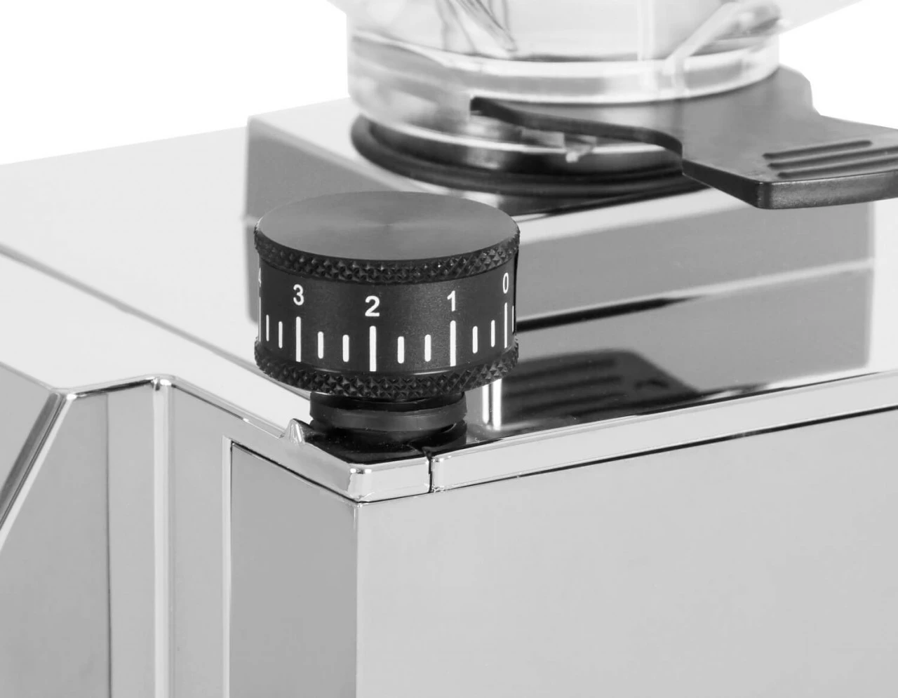Die patentierte 4-Punkt-Aufhängung des Mahlwerkes ermöglicht eine stufenlose Einstellung des Mahlgrades über den kleinen Drehknopf am Gehäuse, dr hier auch etwas größer ist. Die Eureka Mignon XL ist durch das innovative und gleichzeitig robust gebaute Mahlwerk problemlos zu reinigen und Fremdkörper können sehr einfach entfernt werden.