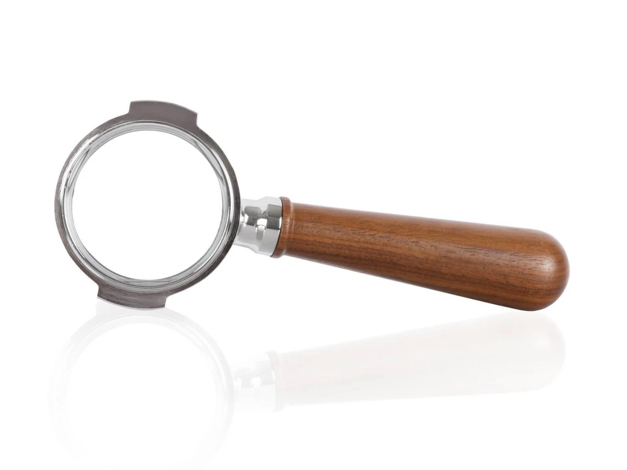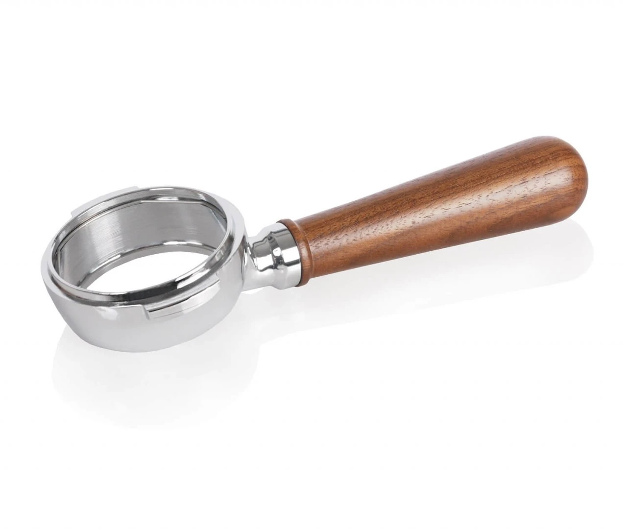Bodenloser Siebträger für die 61er Brühruppe Holzgriff – 6,3mm Flügel (dünne Backen).