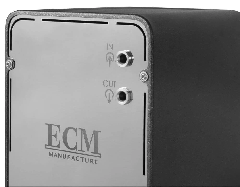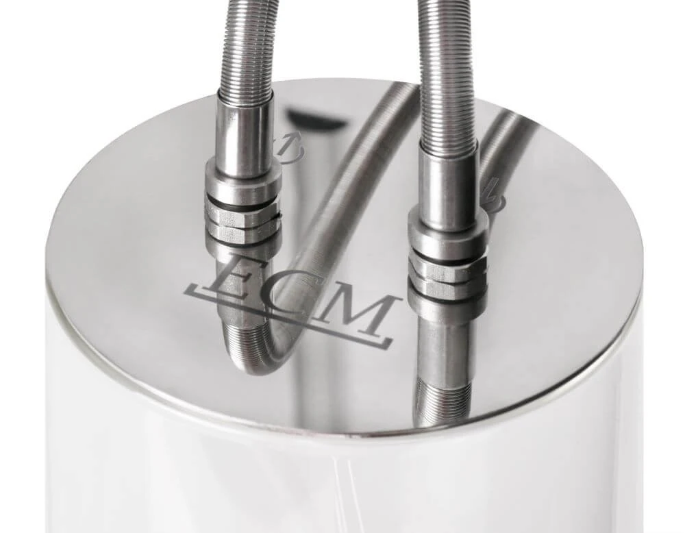 ECM fällt doch immer mal wieder etwas Neues ein. Bisher sollte der Wassertank möglichst unauffällig und platzsparend im Gehäuse verschwinden. Jedoch ist das Befüllen oft umständlich und man muss Tassen abbauen und der Hängeschrank ist im Weg usw.. Das leidliche Plastik der meisten tanks ist auch nicht optimal. Daher einfach mal neu gedacht: so ist die externe Wassertank-Lösung entstanden. Ein hochwertiger Glastank mit Edelstahl- und Silikonschläuchen versorgt die ECM Puristika mit Frischwasser und kann nach Belieben neben der Maschine platziert und easy gereinigt werden.