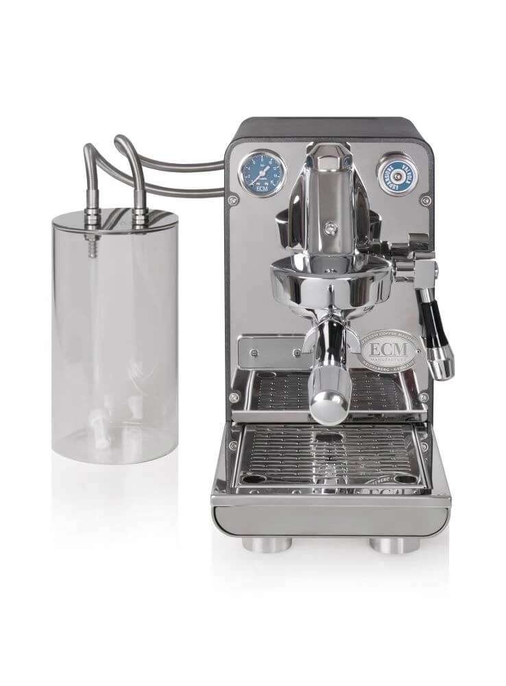 Die neue Einkreis-Espressomaschine ECM Puristika überzeugt mit kompakten Maßen und ist ein echter Hingucker in jeder Küche, Büro oder Kaffee-Ecke. Die klasische E-61 Brühgruppe sorgt zusammen mit der PID-Temperatursteuerung für ein sehr genaue Brühtemperatur und harmoniert perfekt mit dem puristischen Design. Die tiefblauen Farbakzente vom Pumpenmanometer und Expansionsventil runden den Gesamteindruck sehr stimmig ab. Das bewährte ECM Anthrazit-Gehäuse sieht auch bei der kleinen Puristika super aus und überzeugt wie bei den großen ECM Maschinen für Langlebigkeit.
