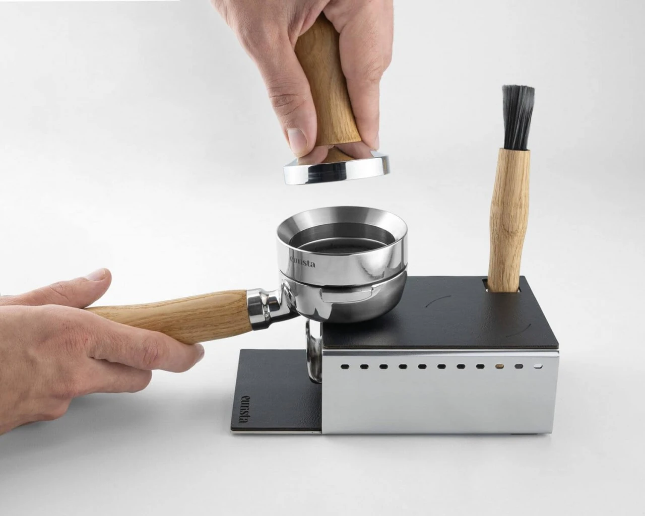 Trotz ihrer kompakten Abmessungen bietet die eurista Tampingstation einen Abstellplatz für Ihren Pinsel, Tamper und Trichter (wahlweise auch Blindsieb).