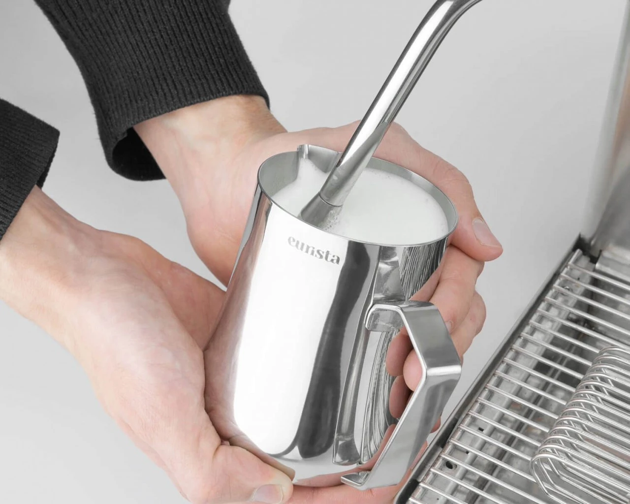 Das eurista Milchkännchen M hat ein Füllvolumen von 50 cl und besitzt damit die ausgezeichnete Größe für die Nutzung im Heimbarista-Segment. Es besteht aus hochwertigem, mit Teflon beschichtetem Edelstahl und ist daher auch spülmaschinengeeignet. Das Material bietet außerdem eine angenehme Temperaturempflindlichkeit beim Schäumen von Milch und hält diese noch lange warm.