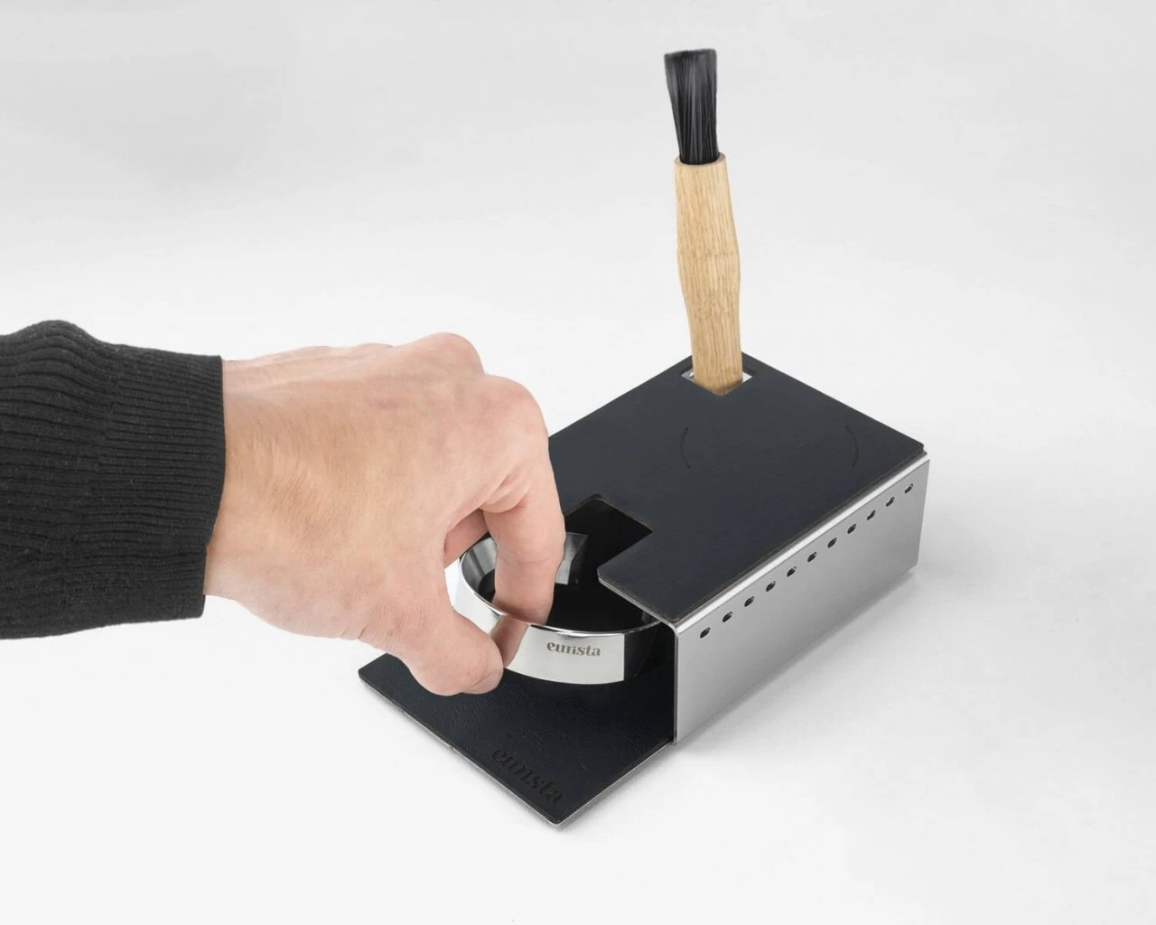 Die eurista Tampingstation fällt durch ihr puristisches Design auf und macht den Unterschied durch ihre hohe Verarbeitungsqualität (made in EU). Durch die Abstellmöglichkeit für Tamper, Pinsel und Trichter wirkt Ihre Kaffee-Ecke stets ordentlich.