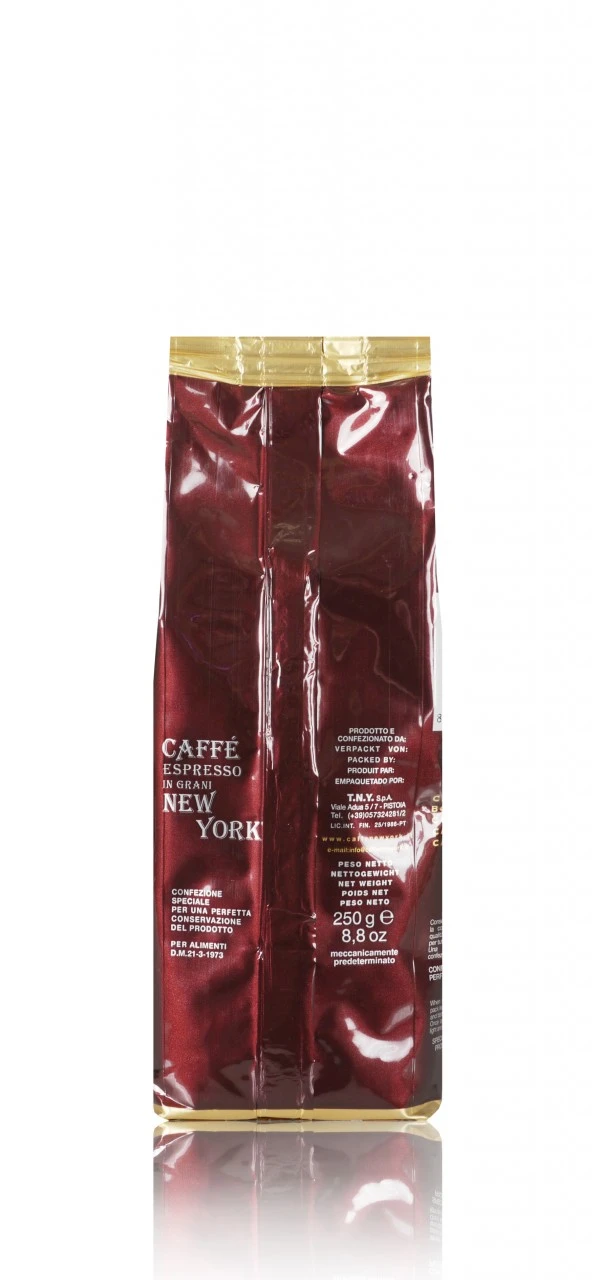 Das Besondere am New York Extra Caffe ist der 5% Jamaica Blue Mountain Bohnenanteil. Dies sind mit die teuersten Bohnen der Welt und werden immer im Eichenfass gelagert und verkauft. So hat der Caffè New York Extra Espresso die Kaffee-Liebhaber mit wundervollen Kaffeearomen überzeugt. Ein besonders ausgewogenes und außergewöhnliches Geschmackserlebnis mit Nuancen von bitterer Schokolade, Gewürzen wie Kardamom und nussigen Anklängen im Vordergrund. Überzeuge Sie sich von den breiten und tiefen Nuancen, dem einzigartigen feinen Duft und dem milden schokoladigen Geschmack.