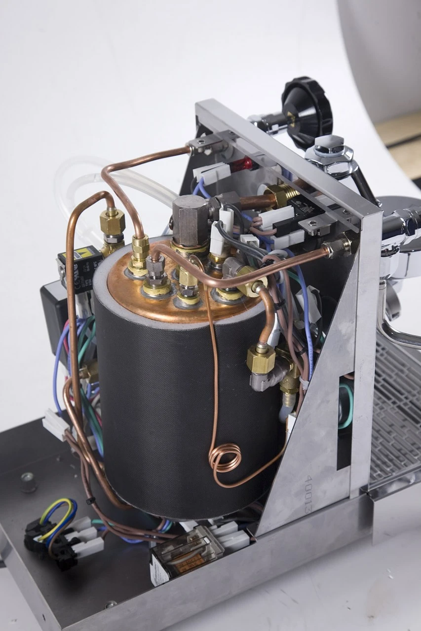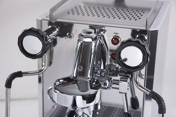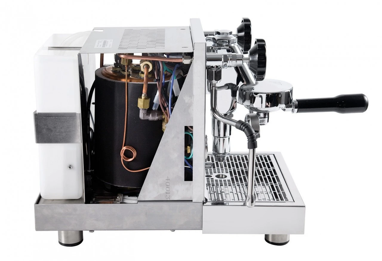 Der Aufbau der Maschine erinnert grob an die Quickmill La Certa hat aber dennoch einige Features mehr. So besitzt sie zum Beispiel zwei getrennte Wasserkreisläufe. So kann ohne Probleme gleichzeitig oder in kurzen Zeitabständen Espresso gemacht und zum Beispiel Milch aufgeschäumt werden. Dies würde mit einem Einkreiser schon einen enormen Aufwand mit sich bringen. Zusätzlich ist ein Manometer zum Ablesen des Kesseldrucks und ein Expansionsventil verbaut. Auch sind in der Front drei Leuchten verbaut die anzeigen ob die Maschine an ist, sie heizt und ob genügend Wasser im Wassertank ist. Die Rubino ist eine echt bemerkenswerte Espressomaschine, die preiswert ist und dennoch auf dem Profilevel von Quickmill mitspielt. Neu seit 2020 ist der überarbeitete Brühgruppenzylinder (Trompete, Glocke, Pilz…) in Edelstahl statt früher verchromte Version. Daher keine Problem mehr mit einer abgelösten Verchromung. Die Siebträger sind im Inneren auch alle Messing/verchromt.