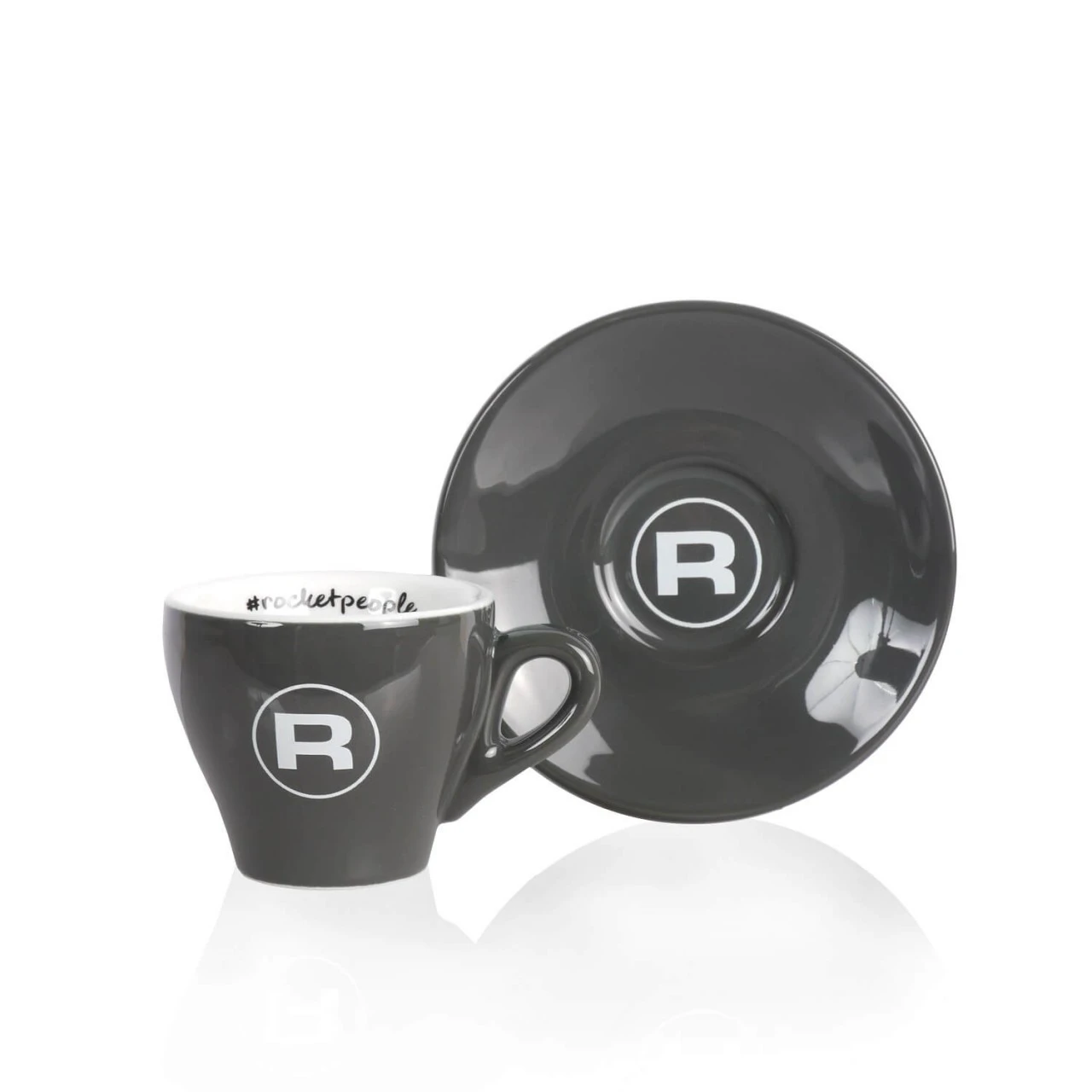 Die Espresso Tasse kommt in einem schönen satten Grau und hat das berühmte Rocket Logo außen aufgedruckt.