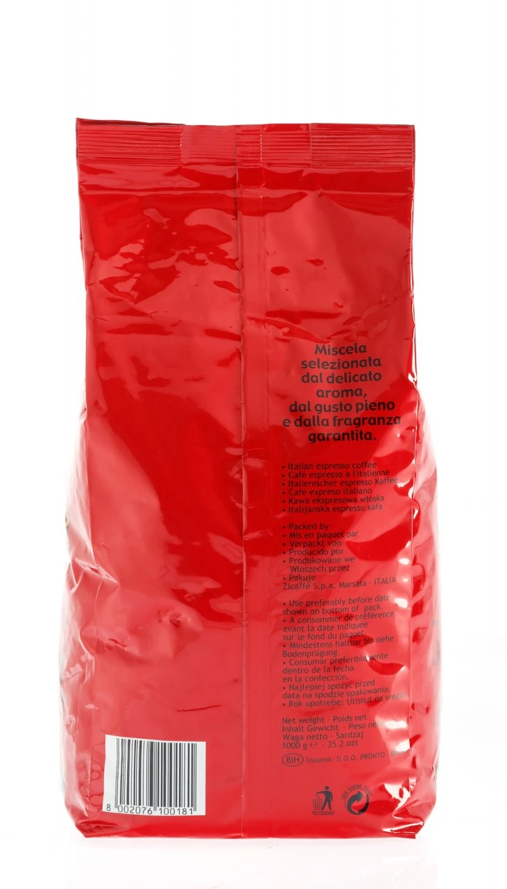 Der Zicaffè Il Tuo (früher unter dem Namen Gusto Rosso bekannt) ist eine Mischung aus 100% feinsten Robustabohnen. Dank der meisterhaften Röstung in der Drehtrommel erhalten die separat gerösteten Rohkaffees aus Indonesien und Mittelamerika sowohl perfekte Farbe als auch den perfekten Röstgrad. Somit entsteht ein mittelkräftiger Kaffee mit sehr guter Cremabildung und mittlerem Koffeingehalt. Der Il tuo überzeugt besonders durch die ausgezeichneten Aromen und den vollmundigen und schokoladigen Geschmack und die dichte Crema. Somit eignen sich die Bohnen perfekt für einen Espresso oder einen Cappuccino.